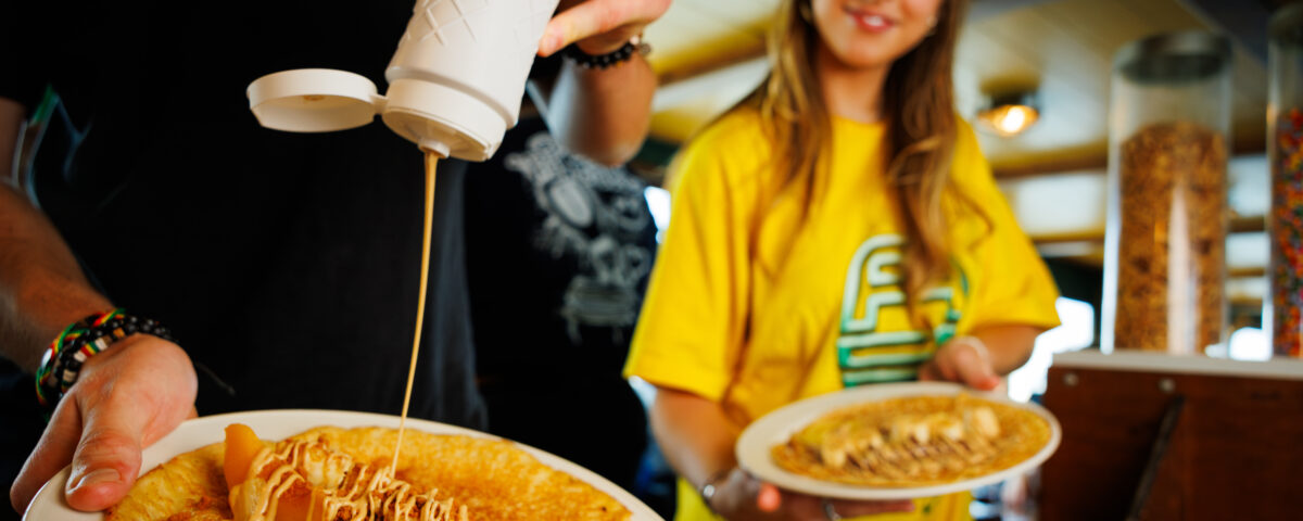 Il Pancake Boat è un battello sul canale che parte dal molo NDSM di Amsterdam Nord. Durante la crociera di 75 minuti, potrete gustare un numero illimitato di pancake. Potete scegliere tra quelli semplici, al bacon o alla mela e aggiungere tutti i condimenti che volete. Il battello passa davanti a icone come la Torre A'DAM, il Museo del Cinema EYE e l'Isola REM.